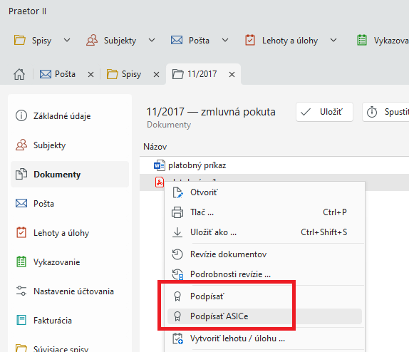 Následně podpis provedete z kontextového menu nad vybraným dokumentem: