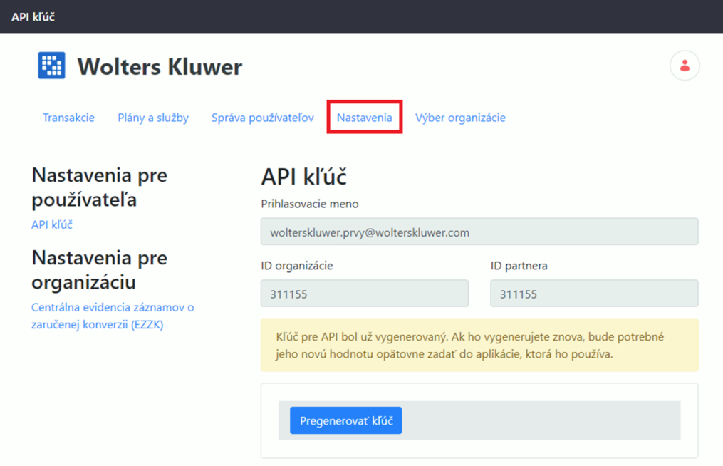 Privátní klíč i ostatní požadované informace by měly být dostupné ve Vašem účtu na Podpisuj.sk, v Nastavení (je možné, že váš plán u podpisuj.sk neobsahuje možnost API Klíč, v takovém případě zkuste kontaktovat Podpisuj.sk).
