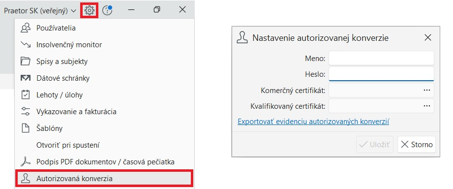 Nejprve je třeba v Praetoru v Nastavení – Zaručená konverzia vyplnit požadované údaje. Ty jsou k dispozici na stránce podpisuj.sk