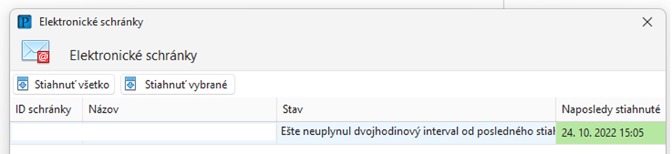 Tu vidíte aktuálny stav schránok zadaných do systému. Môžete dať Stiahnuť všetky, alebo pokiaľ máte viac schránok, označíte riadky so schránkami, ktoré chcete stiahnuť a zvolíte Stiahnuť vybrané.