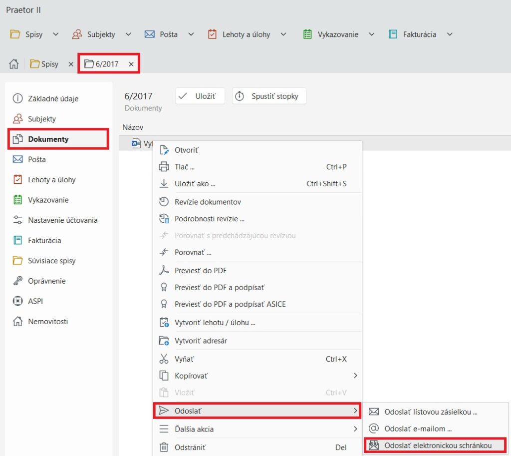 Najpohodlnejší spôsob je založiť poštu priamo cez kontextové menu dokumentu. Pravé tlačítko myši – Odoslať – Odoslať elektronickou schránkou.
