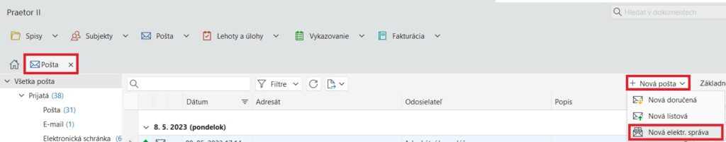 Poštu môžete tiež vytvoriť priamo z prehľadu pošty. Nová pošta – Nová elektr. správa: