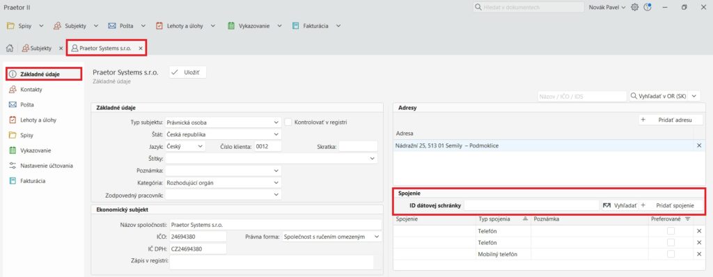 - Vlastník schránky v jeho nastaveniach musí byť v Praetore založený ako subjekt a tento subjekt musí mať správne vyplnené ID el. schránky.