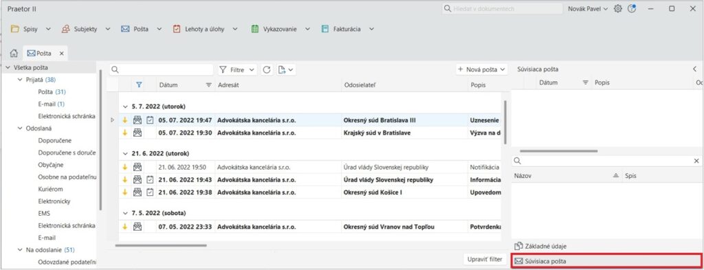 Je to ideálne vidieť, keď označíte riadok s vybranou elektronickou správou a vpravo dole kliknete na tlačítko Súvisiaca pošta – vpravo hore se potom zobrazia spolu súvisiace správy.