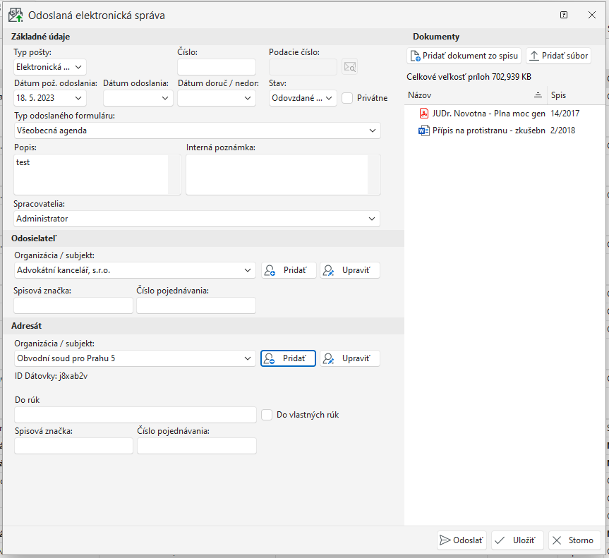 Maska pošty je veľmi podobná záznamom o pošte listovej či e-mailovej. Na Vás je vybrať adresáta a odosielateľa, doplnit Popis. Ďalej môžete vybrať spracovateľa danej pošty, do priestoru vpravo pridať ďalšie dokumenty. Po kliknutí na Odoslať Praetor správu odošle.